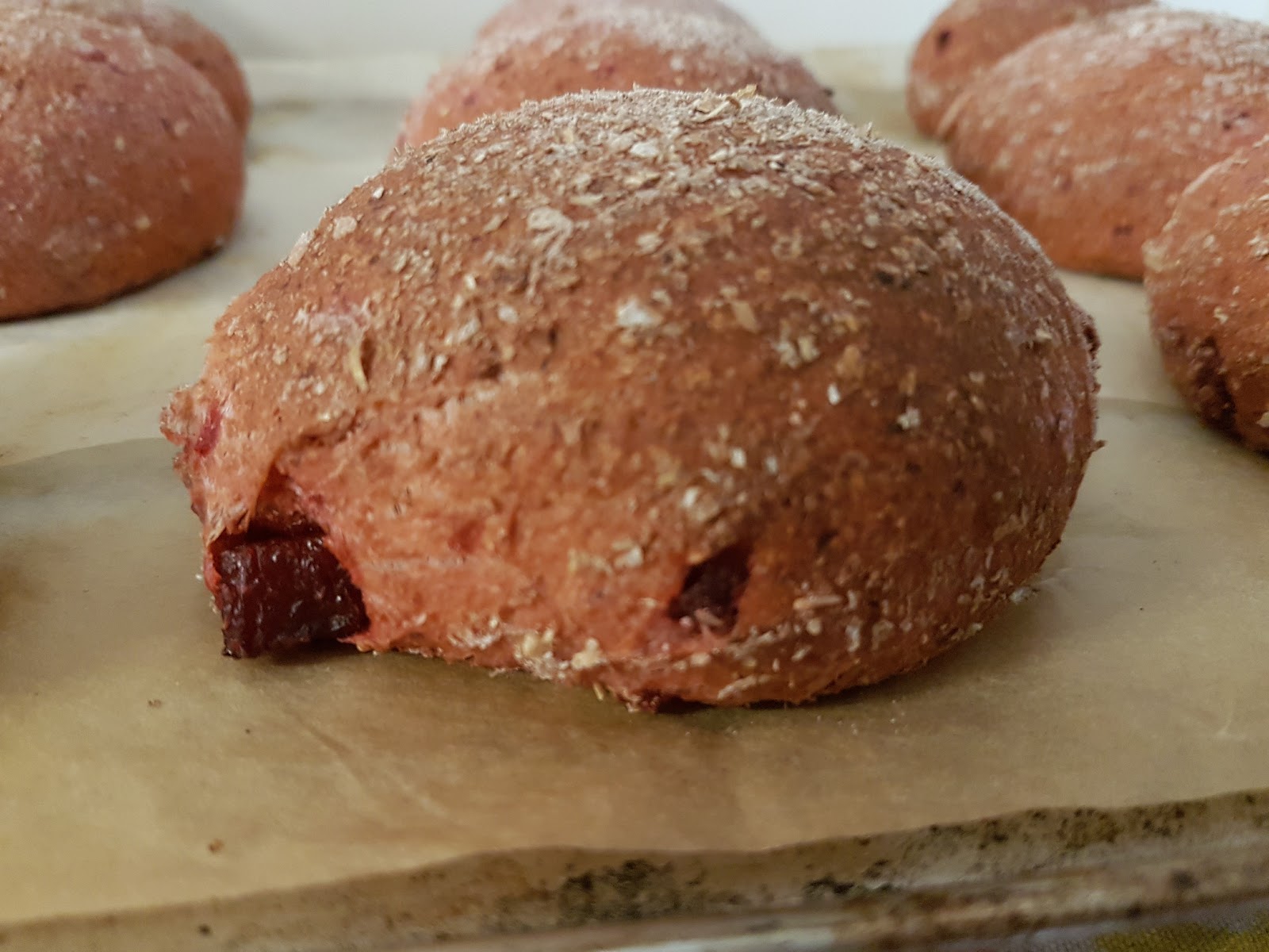 I put 500g of chopped beetroot in 1000g of flour, 635g water, 40g Olive Oil and 20g each of yeast and salt. The amount of water has been reduced to allow for the liquid in the package. It’s beetroot juice, don’t waste it.