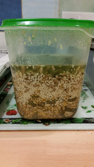 12 hours before you’re going to bake, place all of your seeds in a medium sized container, cover with 400g of boiling water and the 14 g of salt.