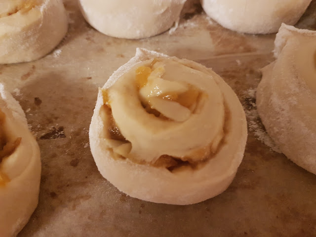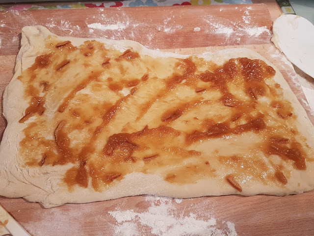 In the past, I’ve made savoury rolls, like cheese and pickle, or chorizo and sun-dried tomato, this time I’m going for a sweet version. I have some Blood Orange fruit spread, although this would work with marmalade or any fruit jam.