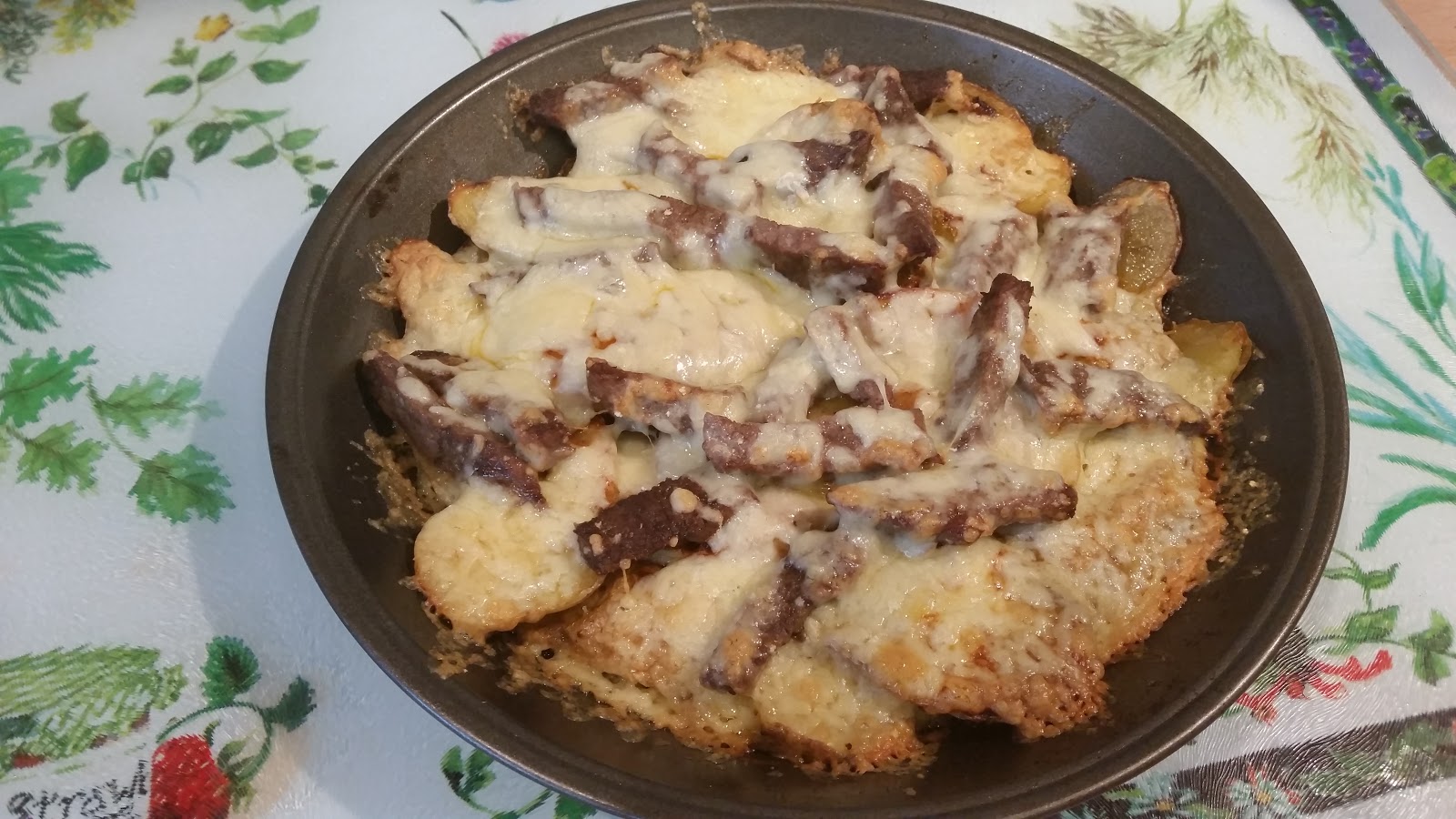 So I lined my oiled dish with the cooked potato peels, defrosted.