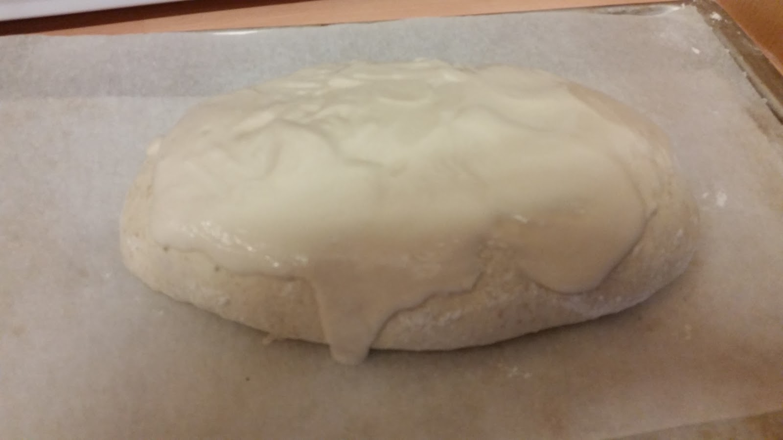 Mix all the ingredients together and ensure that there are no lumps in the paste. Turn the oven on as appropriate to heat up to 240° C. After knocking back, dividing and shaping the main dough, leave it to rise for 20 minutes. Then GENTLY paint the paste on top of the part-risen dough with a pastry brush. Try not to deflate the dough too much. Leave it for another 20 minutes to continue rising before baking. The rolls will take about 18-20 minutes, the loaf around 40 minutes. The internal temperature should be at least 95° C when the loaves/rolls are baked. If you don’t have a thermometer, they will sound hollow when tapped on the base.